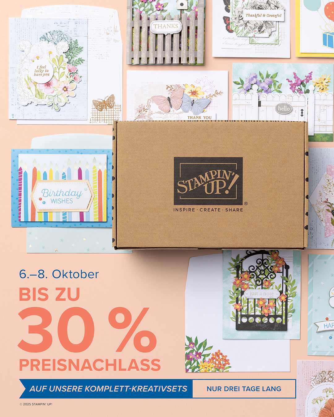Vom 6.-8. Oktober gibt es bis zu 30% auf alle Stampin‘ Up! Kreativsets! Ich empfehle dir das Kreativset „Spukhaus“ für Halloween und das Set „Jede Menge Weihnachten“ für schnelle Weihnachtskarten. Aber es gibt so viele schöne Sets, schaut selbst mal nach. Die Sets sind auch eine schöne Geschenkidee für Weihnachten, durch den tollen Karton sind sie perfekt zum verschenken.