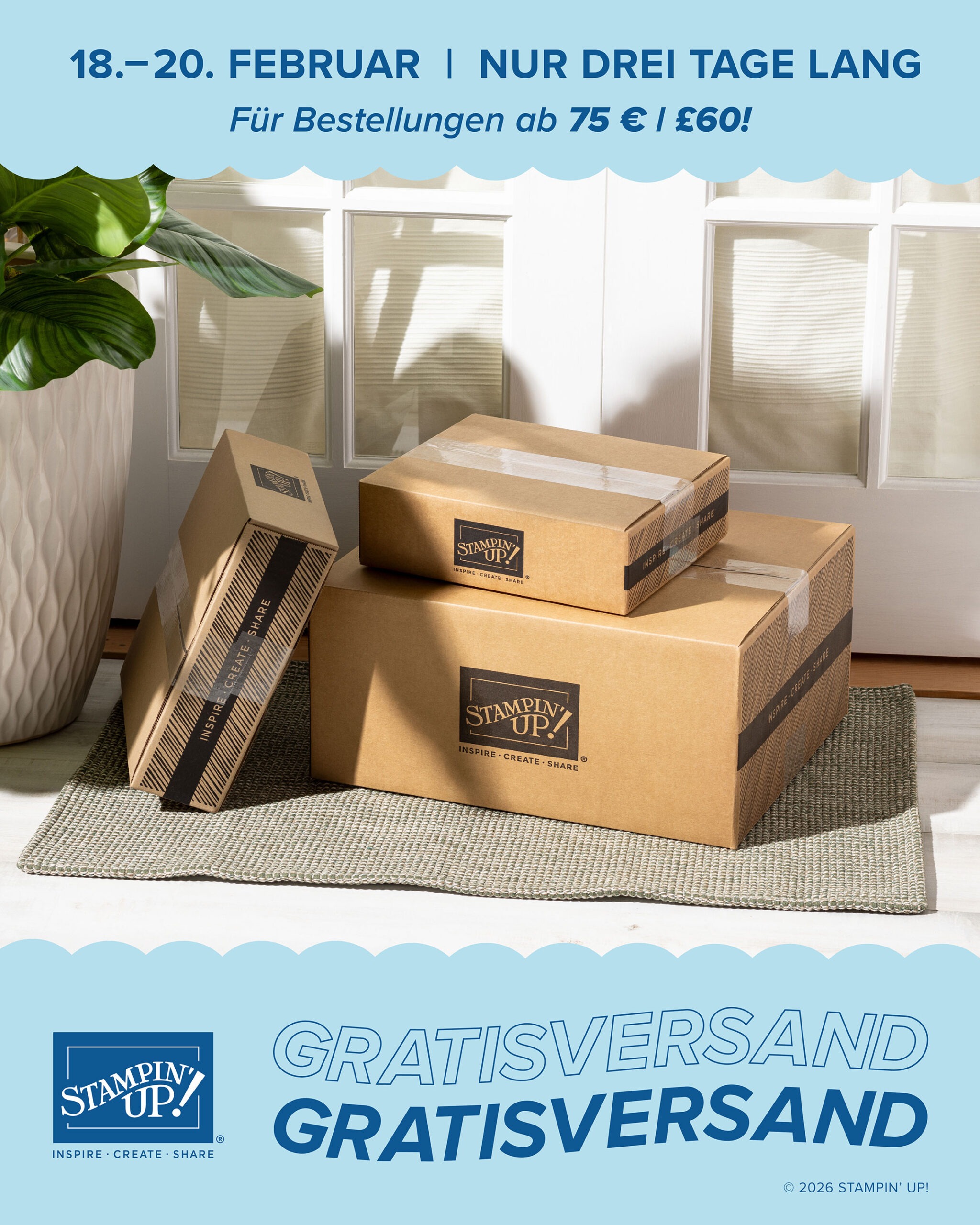 Von Mittwoch bis Freitag (18. – 20. Februar) ist der Versand ab einem Warenwert von 75€ bei Stampin‘ Up! gratis. Nutz die Chance uns spare 7,95€. Wer hat, kann auch noch seine Gutscheine der Bonustage einlösen. 🙂